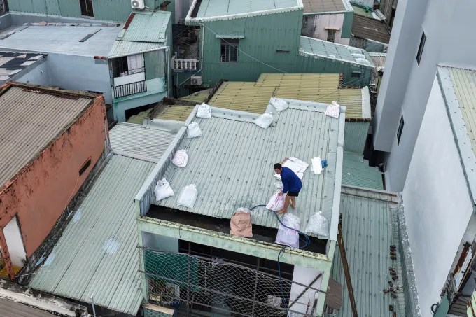 Người dân Quy Nhơn gia cố mái tôn trước bão. Ảnh: Thanh Tùng