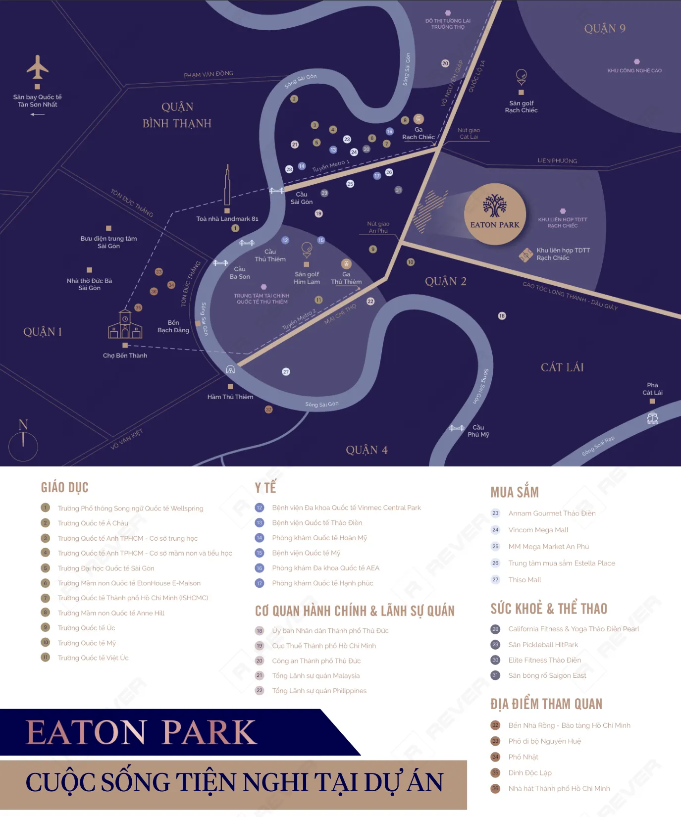 Vị trí của dự án Eaton Park rất đẹp, phía Tây Bắc là sông Sài Gòn và phường Thảo Điền, phía trên kết nối nhanh với Xa Lộ Hà Nội, phía dưới di chuyển nhanh ra tuyến cao tốc Long Thành - Dầu Giây. Hai huyết mạch này chính là hai hành lang phát triển các khu đô thị mới có mật độ xây dựng cao, đồng bộ về hạ tầng xã hội và kỹ thuật đô thị của quận 2 nói riêng và của TP. Thủ Đức nói chung.